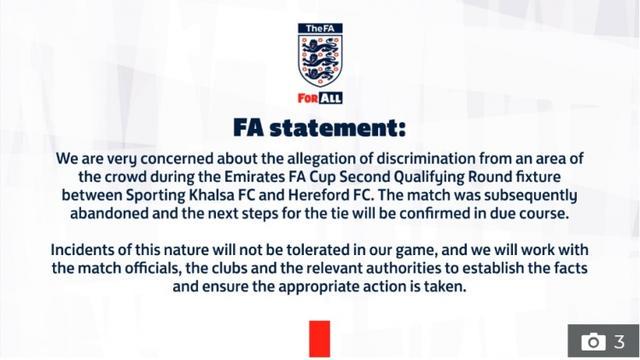 Sporting Khalsa随后也发布了一份声明,称在对阵Hereford的足总杯比赛中,下半场发生了针对其守门员Ravan Constable的种族歧视言论。